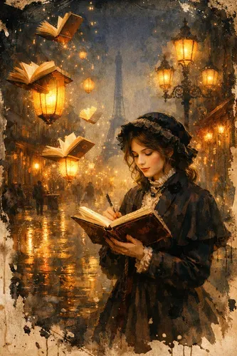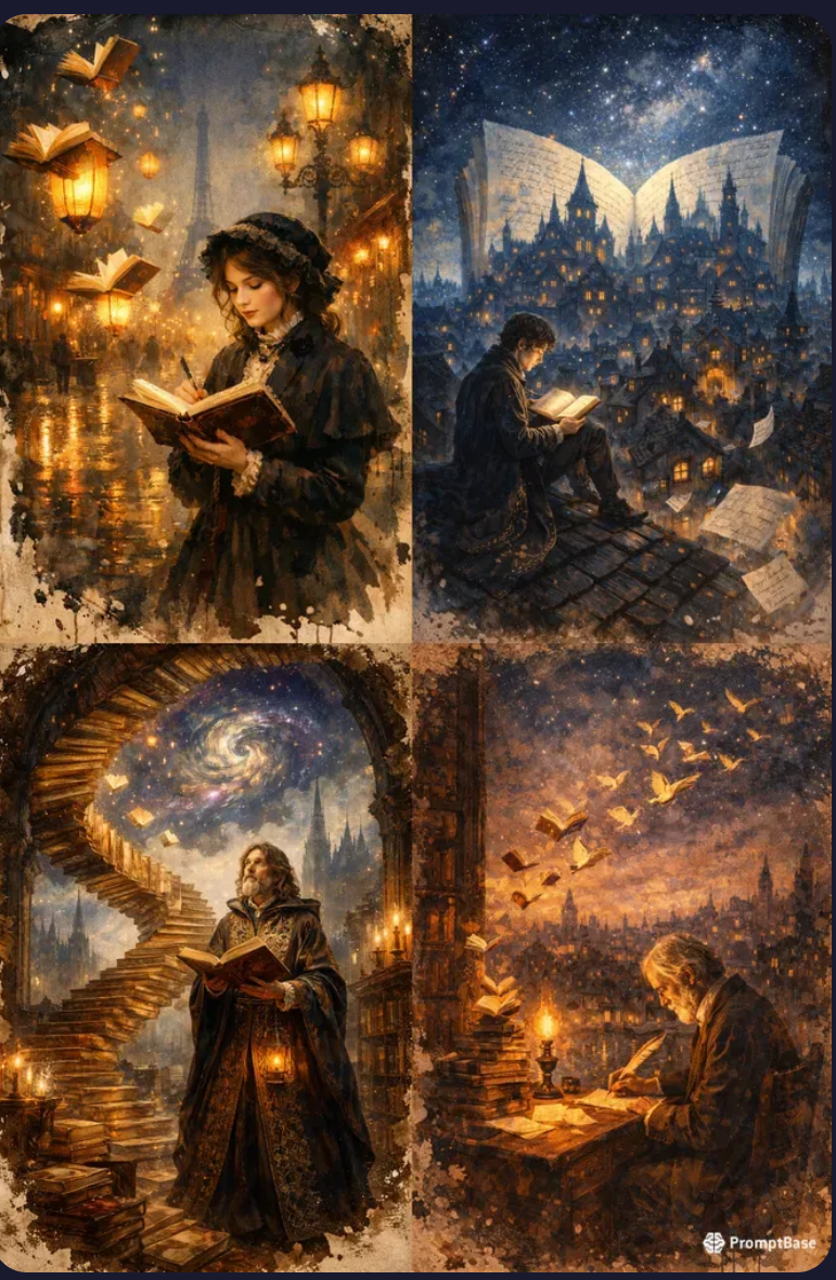 A surreal literary collage series blending romantic city nights, imaginative characters, and magical books where reality dissolves into poetic storytelling and painterly dreamscapes.
